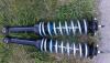 Here are the rear coil-overs which might be of interest to anyone looking to switch to coilovers or change their spring rates. The combination of coil-over sleeves and collar clamp would accommodate a wide range for a lift. It took a bit of searching to find the right strut combination of top/bottom mount, body length, travel and damping rate. These are KYB 341054 struts (I had to trim the lower mount sleeve to fit into the XT6 trailing arm). Got them on sale for $17 each but one was black and the other silver so I had to paint. They give 6" of travel; I'll have it set for 3" up-travel and 3" down. I can spin the spring perch to adjust. The springs ( QA1 10" 150# spring rate) are mounted on Allstar coilover sleeves from Summit. I used collar clamps for the lower support. Here it is mounted on the Brat at full droop: Weird photo effects; the springs are really silver and the undercoating is black.