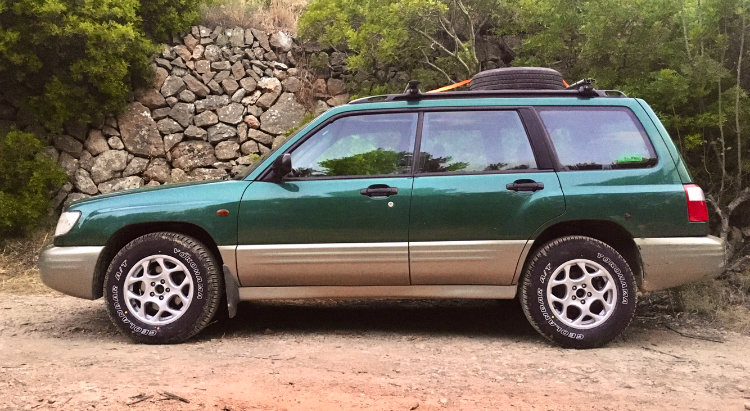 9. I just fitted my new Yokohama G015 215/70R15 tires on the 48mmET 7jx15 rims that came off the silver forester (a dealer option). Very happy with the result: the tires are a published 14mm larger in diameter than the 205/70 they replace. Theoretically they are 2.2% larger in diameter, circumference, and speedo error. In actual fact they are a whole 26 mm larger. This is 4% difference in size, giving a speedo reading of 50 mph at an actual 52 mph. Negligible really. As a side note these Yokos run quieter and smoother than the General Grabbers they replaced, I have not yet tried them in the wet, but dry and loose surface A++. As a kitsch bonus they have white lettering which was unexpected. Physically they will just fit (clear) under our silver car’s standard Forester struts. This green car however has new KYB Forester SF springs on new Legacy Outback KYB Excel-G struts. More strut clearance and greater ride height in the rear. The front is getting small lift soon.