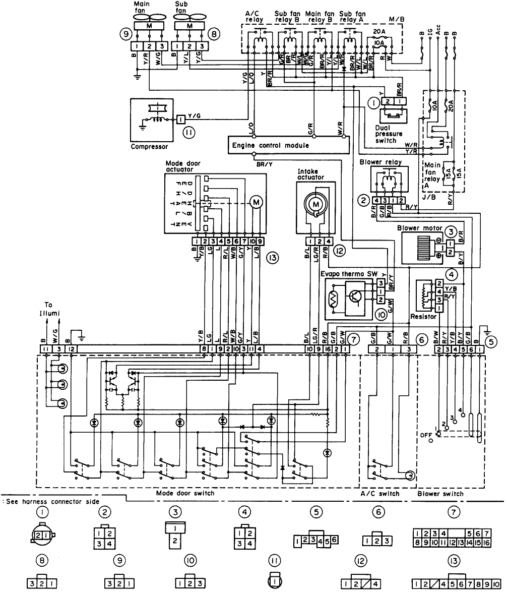 TheRyster Posted January 9, 2020 Share Posted January 9, 2020 It appears that this thread is a top-search result concerning the blend doors not working. Realizing that this forum is for literally a ton of cars, it's good to note that the Orig Poster is talking about a Gen 1 (1999) Legacy Outback Wagon. If you do not have this model and year, this thread isn't really going to (and shouldn't) apply to you. The mode door actuator, flap motor, heater mode motor are just some of the many names used to describe the motor that moves a set of levers which are connected to flaps that direct airflow in the car's cabin. The levers are all connected and controlled at one point, this is what the motor moves. There are 3 main positions and 2 halfway positions between those three. step 0: is to check all fuses. then obviously after each step, start the car, run the fan and test...If that doesn't get the system changing airflow direction, then step 1: It's definitely good to first clean your center console unit with windex or other liquid that will wash out any dried high fructose corn syrup left by spilled sugary drinks. i'd do this with the control unit removed from the vehicle, see instructions below to get to it. 4 screws on the sides and down below in the passenger foot well disconnect the wire. once dry reassemble and test, if it works you had sticky buttons. If that doesn't get the system changing airflow direction, then step 2: remove the cup holder (2 screws on sides) and pull out. at those 2 screw hols you'll notice that the top trim tabs are behind the lower trim tabs. Gently pull the lower center console trim towards you just enough to lift up the top trim to wiggle it out from behind the lower trim. pull out the top of the console (the center vents) and disconnect the hazard button. note: the car's turn signals will not work with this disconnected, so definitely reconnect this before driving! now reach back behind the control unit and wiggle the wires a bit while pressing buttons, if that gets the mode doors to change you have loose connectors. If that doesn't get the system changing airflow direction, then step 3: lets take a look at your actuator motor. It easily located up above the gas pedal in the driver's footwell, attached to the side of the center console. It's a small black box with a brown connector. it's mounted to a metal bracket, by... 2 screws? Remove the two screws with a stubby screwdriver or a small ratchet with a phillips screw bit, ya know, something for tight spaces. it should fall out away form the center console. With it dangling, test the buttons again... does the little white arm move? no? motor might be bad or control unit might be bad and not sending a signal... at this point you can get a multimeter out. disconnect the brown connector and run some tests. There are 10 pins. Pin 1 is ground, should be Black according to my subaru gen 1 wiring diagram. find it and make sure its a good ground. it's easy to figure out, since pin 8 is not used, it's at the opposite end of that 'space'. Jam a very small wire in that hole and then alligator clip it to the black wire of the multimeter. Get another small wire and test pins 2 (vent) to 7 (defrost) for voltage for each of the buttons. now..don't ask me what the voltage is suppose to read because my stuff 'aint working either. I've got two control units and yes the lights light up under all the buttons as they are pressed, one sends 12v to pins 2,3,4 no matter what button is pressed, and the other sends 12v to all the pins (2-7) no matter what button is pushed. I tested that the 16 pin harness to the back of control unit has a good ground and 12v in. I can only conclude that I have 2 bad control units. will grab a third from the junkyard soon and test. any EE want to translate the wiring diagram? What should we be expecting at the mode door actuator for each mode button? Link to comment Share on other sites More sharing options...