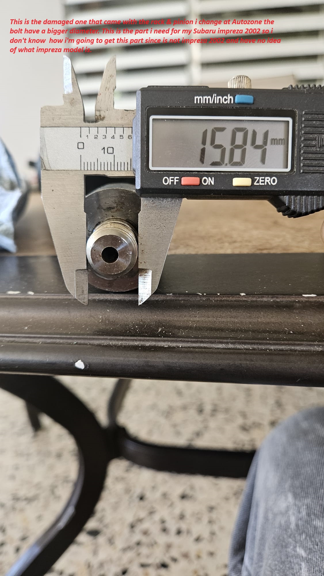 Norbert58 Posted August 25, 2024 Share Posted August 25, 2024 My ride is a Subaru Impreza 2002 WRX turbo and way years ago i replace the rack and pinion for a remanufactured one at Autozone i have a problem with one of the inner tie rod end and i just buy a new one for my ride with the problem that looks if this rack is not the original that use my car .,the part that i buy for my car is a replacement for WRX 2002 and does not fit in the rack and pinion the replacement i buy the bolt is more smaller so i have no idea how i'm going to get the part that fit my car also the part that came in my car is a bit larger..see the pics explained Link to comment Share on other sites More sharing options...