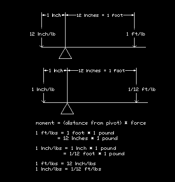 mikeshoup Posted August 11, 2006 Share Posted August 11, 2006 1 ft 12 in 12 in----- ----> ------ ----> -----------1 lb 1 ft 1 lb A little bit of unit conversion for you 1 ft/lb = 12in/lb Sorry for a bit... future math teacher, and I wanna use some of that physics I've learned in college: Actually, your unit conversion is wrong. Torque is a cross product of Force X Distance, or the vector multiplication of the moment of Inertia * Angular Accelration. As such, the units are Force * Distance. So, the correct unit conversion should be: 1 (ft*lb) * 12in/1ft = 12in*lb Pretty simple. But yes, essentialy multiple by 12 to go from feet to inches. Link to comment Share on other sites More sharing options...